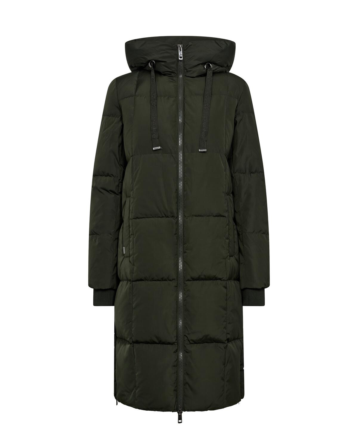 Denne lange dunjakke i mørkegrøn er designet med quiltede overflade med brede kanaler. Jakken har en stor, justerbar hætte med brede snører, lukkes med en praktisk tovejs-lynlås foran og er udstyret med ribstrikkede manchetter. Den lange pasform giver eks